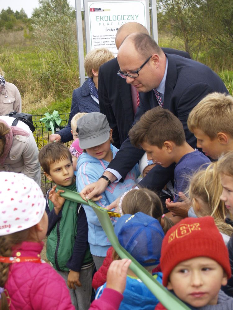 W otwarciu ekologicznego placu uczestniczył prezydent Gdańska Paweł Adamowicz, który z uwagą wysłuchiwał pierwszych opinii młodych użytkowników na temat nowego miejsca zabaw.
