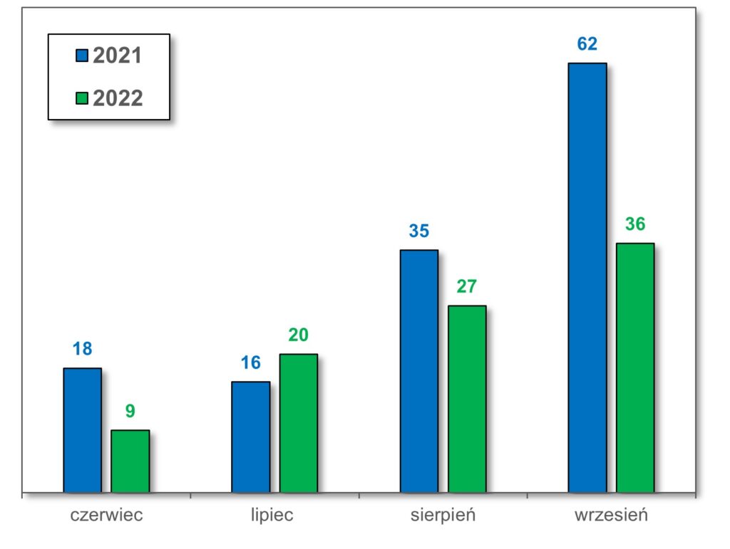 Poniższe zestawienie porównuje liczbę zgłoszeń od mieszkańców dotyczące uciążliwości zapachowych w roku 2021 i 2022. Patrząc na wykres należy pamiętać, iż w miesiącach letnich prowadzone były intensywne prace związane z programem REDU, które mogły generować epizodyczne emisje zapachów. Wraz z rozpoczęciem jesieni pojawiły się natomiast warunki meteorologiczne charakterystyczne dla tej pory roku (takie jak duże amplitudy temperatur oraz zjawisko inwersji), które mają wpływ na odczuwanie zapachów w mieście. Na wykresie widać jednak wyraźny spadek liczby zgłoszeń. I ta tendencja spadkowa jest celem działań w ramach prowadzonego programu.