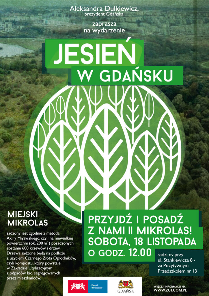 W sobotę, 18 listopada o godz. 12.00 zapraszamy mieszkańców do posadzenia drzew w drugim miejskim mikrolesie. Mikrolas będzie sadzony na terenie przy ul. Stankiewicza 8, za Pozytywnym Przedszkolem nr 13. Akcja sadzenia lasu odbywać się będzie od godz. 12.00 do posadzenia ostatniego krzewu i drzewa z 600 sadzonek! Na miejscu będą stoiska edukacyjne Pomorskiego Ośrodka Rehabilitacji Dzikich Zwierząt Ostoja, Straży Miejskiej, Gdańskich Wód, Gdańskiej Infrastruktury Wodociągowo-Kanalizacyjnej oraz Zakładu Utylizacyjnego. Chętni będą mieli również okazję założyć sobie kartę mieszkańca w Mobilnym Centrum Obsługi Karty Mieszkańca.